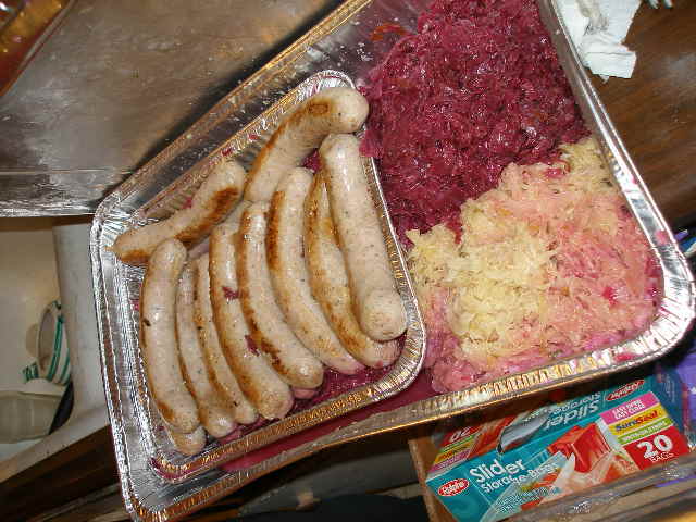 Apparently they had an Oktoberfest celebration at the place she disappears to for about 40 hours every week (she calls it “work”, I call it neglect) and there were a LOT of sausies left over because the silly people didn’t know what they were missing!  So my dutiful vegetarian mom went in and scooped up about 30 sausages, sauerkraut, and red cabbage and brought them home to ME!!!