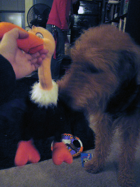But back to more important things, MY NEW TOYS. In addition to the Chuck-a-Duck, I also have a spanking new stuffed vulture that makes a VERY satisfying sound when chomped.
